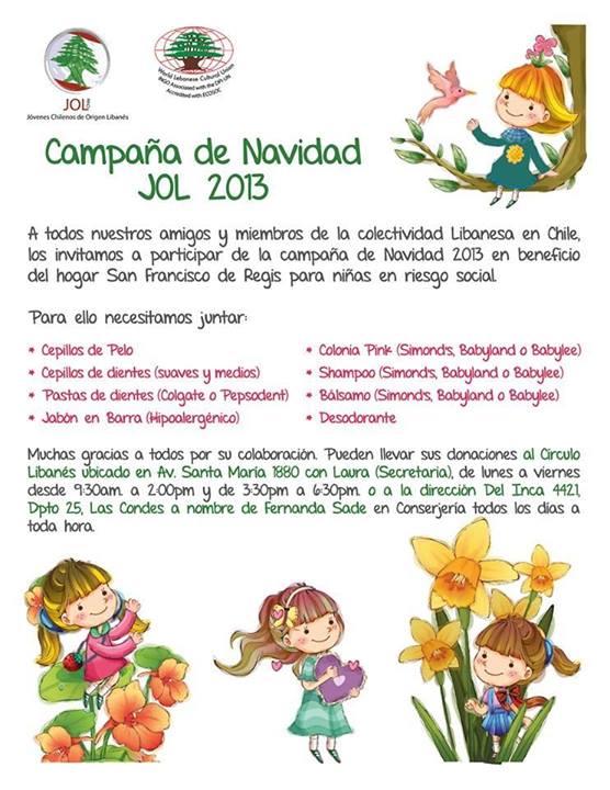 A nivel local y de forma paralela, JOL estuvo trabajando arduamente en actividades de carácter social, sobre todo. Nuestra institución apadrina al hogar de niñas “San Francisco de Regis”. Este año ya hemos realizado tres visitas a dicho hogar, la última correspondiendo a la visita de Navidad. En cada una de estas visitas hemos entregado regalos, compañía y cariño a las chicas, quienes siempre se muestran eternamente agradecidas con nosotros. Como parte de nuestra misión como institución libanesa, siempre les llevamos a las chicas un “mensaje libanés”, explicándoles quiénes somos y por qué hemos tenido el interés en ayudarlas y acompañarlas.