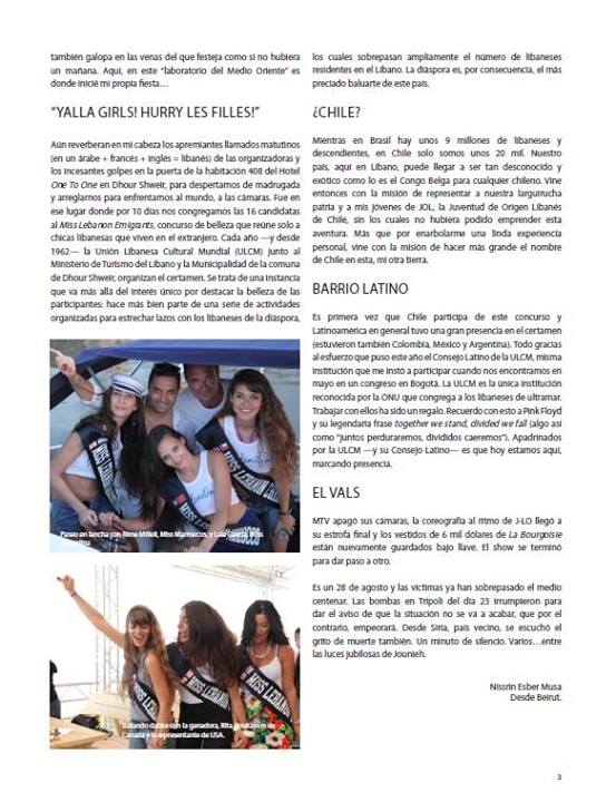 En segundo lugar, durante el congreso de Bogotá, determinamos que participaríamos del “Miss Lebanon Emigrants”. Fue así como elegimos a nuestra representante, la entonces Presidenta señorita NissrinEsber. Tras una feliz participación en dicho concurso que se llevó a cabo en Líbano durante agosto, Nissrin también representó a JOL Chile, junto a otro de nuestros miembros, la señorita Noelia Rojas, en el “Primer Congreso Mundial de Jóvenes de la ULCM”, llevado a cabo también en Líbano en el mismo mes.