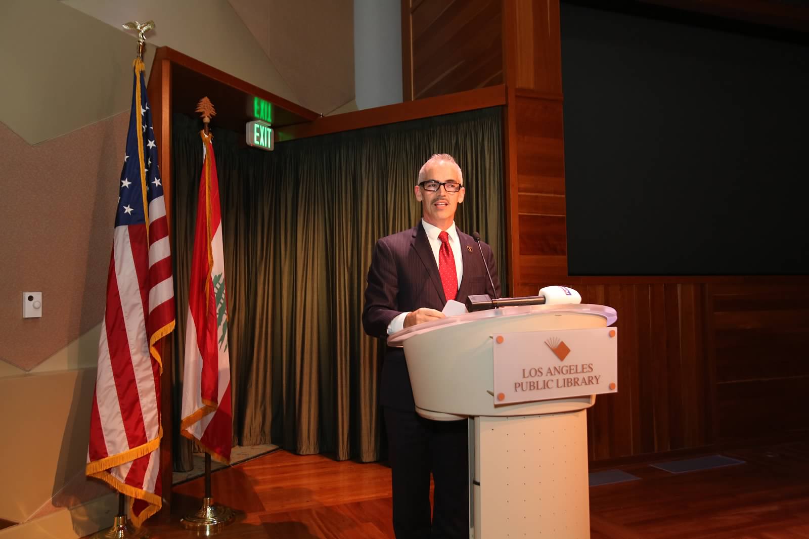 من ناحية أخرى، وبدعوة من الجامعة اللبنانية الثقافية في العالم في لوس أنجلس وكاليفورنيا، أزيح الستار عن تمثال جبران خليل جبران الذي قدمته الجامعة إلى مدينة لوس أنجلس في المكتبة العامة الرئيسية للمدينة. حضر الحفل النائب سامي الجميل الذي لبّى دعوة الإفتتاح بمناسبة وجوده في المدينة، أمين مكتبة المدينة جون سزابو، أعضاء مجلس مدينة لوس أنجلس ميتش أوفاريل وطوم لابونج، عضو مجلس المدينة السابق دنيس زين، الرئيس العالمي للجامعة أليخندرو خوري فارس، القاضي جيمس كعدو، عمدة مقاطعة لوس أنجلس جيم مكدونل وأكثر من ٢۵٠ شخص. وقد أقيم للمناسبة حفل إستقبال تخلله كلمات لمسؤولين من المدينة والجامعة.