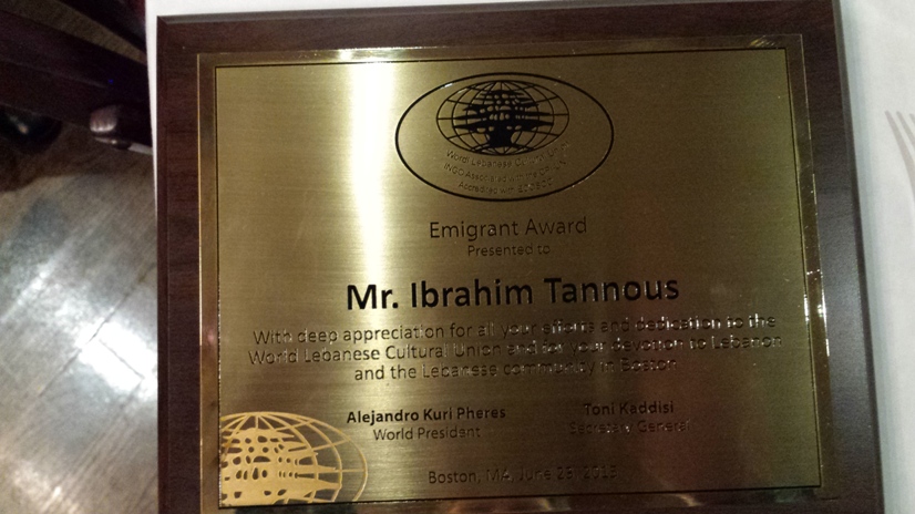 وخلال الحفل، قدم الرئيس العالمي درعاً تقديريةً لإبراهيم طنوس، الرئيس السابق لفرع بوسطن، وصاحب جريدة Profile News، تقديراً لعطاءاته في سبيل الجامعة والإغتراب.
