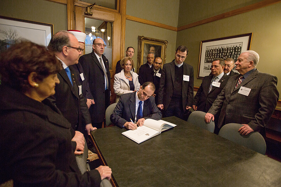 بدأت المراسم بتوقيع القائم بالأعمال على سجل التشريفات، بحضور ممثل الوزير فرعون، ممثل الرئيس العالمي، رئيسة فرع تورونتو ليلى الحاج ومسؤولي الجامعة القاريين والمحليين، ثم انتقل الجميع لحضور إجتماع في مكتب رئيسة الحكومة بحثت فيه أمور الجالية، وتبادل فيه القائم بالأعمال وممثلة رئيسة الحكومة (لوجود رئيسة الحكومة في الصين) الهدايا التذكارية.