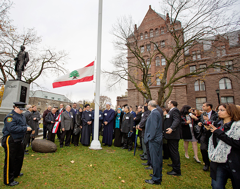 بعده انتقل ممثلو الأحزاب في ولاية أونتاريو والوفود اللبنانية إلى الخارج حيث رفع القائم بالأعمال، وممثلو الطوائف، ومسؤولو الجامعة العلم اللبناني على الناصية المخصصة لذلك أمام البرلمان، على وقع النشيدين اللبناني والكندي.