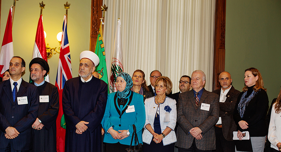 ولقد ألقيت عدة كلمات في الإحتفال لكلٌ من النائب ريك نيكوليس ممثلاً رئيس المجلس، والنائب لورا ألبنيزي ممثلةً رئيسة الحكومة كاتلين وين، وزعيم الأقلية، رئيس حزب المحافظين باتريك براون، والنائب كاترين فايف ممثلة حزب الديمقراطيين الجدد، والقائم بالأعمال سامي حداد، ثم رئيسة فرع تورونتو في الجامعة السيدة ليلى الحاج.