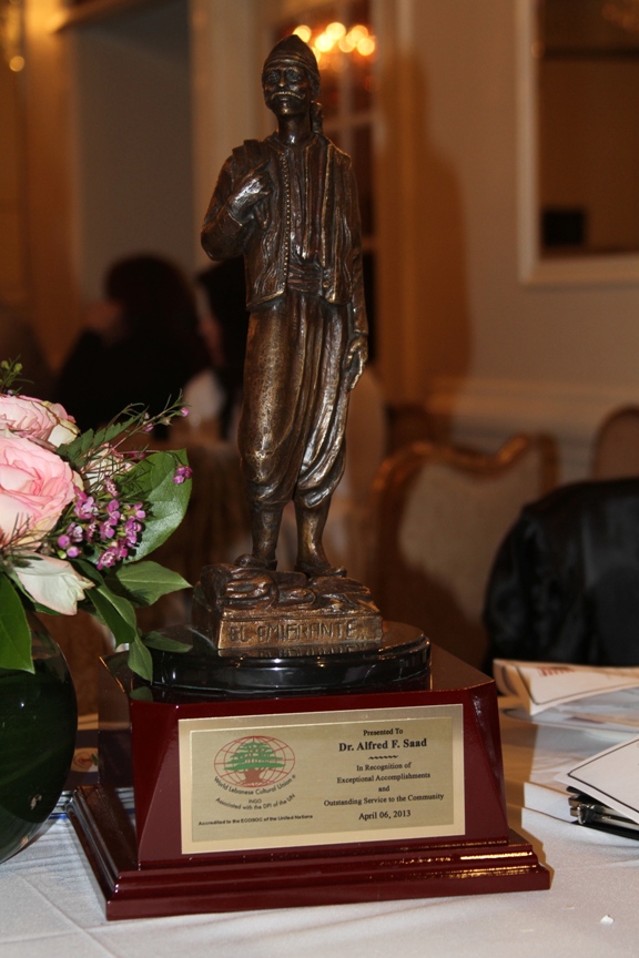 كما كرّم الفرعان الرئيس القاري الأسبق الراحل الدكتور ألفرد سعد، الأديب والشاعر والصحافي اللامع. وألقى الشاعر ميلاد ساسين قصيدة في الدكتور سعد، أعقبها تسلّم زوجته السيد كارول وإبنها وسيم لتمثال المغترب.